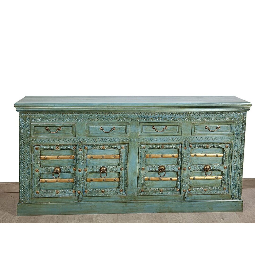 Aparador estilo marroquí en madera de mango. Cuatro puertas con cuatro cajones. Con detalles labrados y metal dorado, Medidas 180 x 40 x 90
