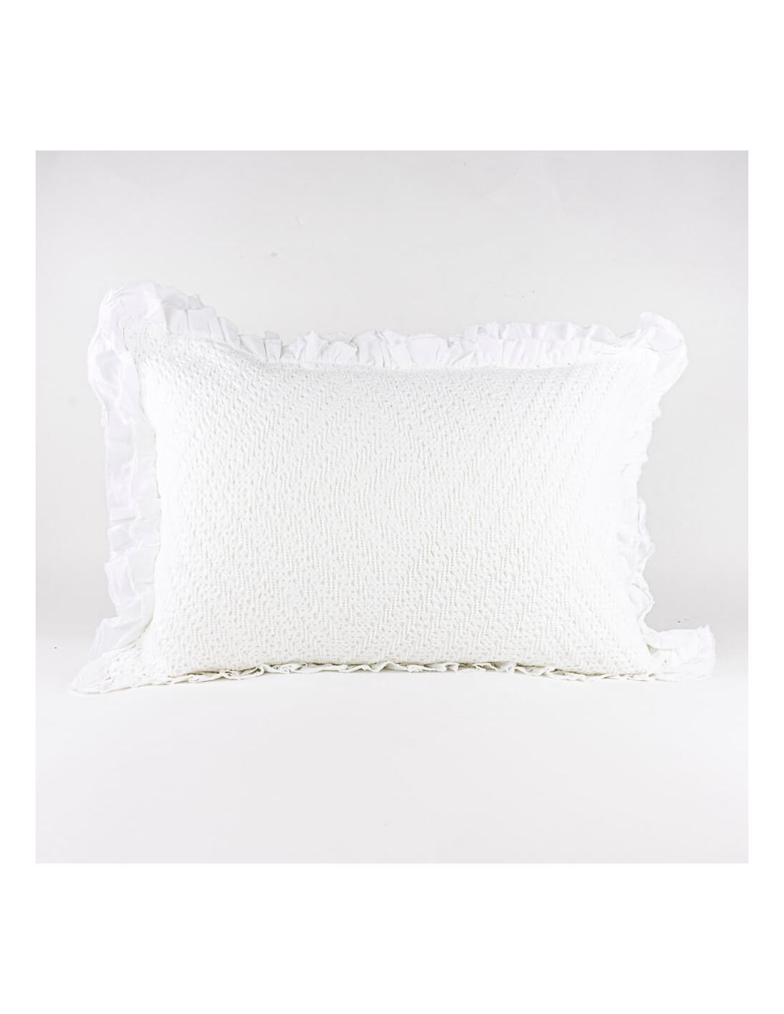 Cojín en tejido 100% algodón prelavado con volante de tejido. Medidas 50 x 70 Disponible en varios colores.