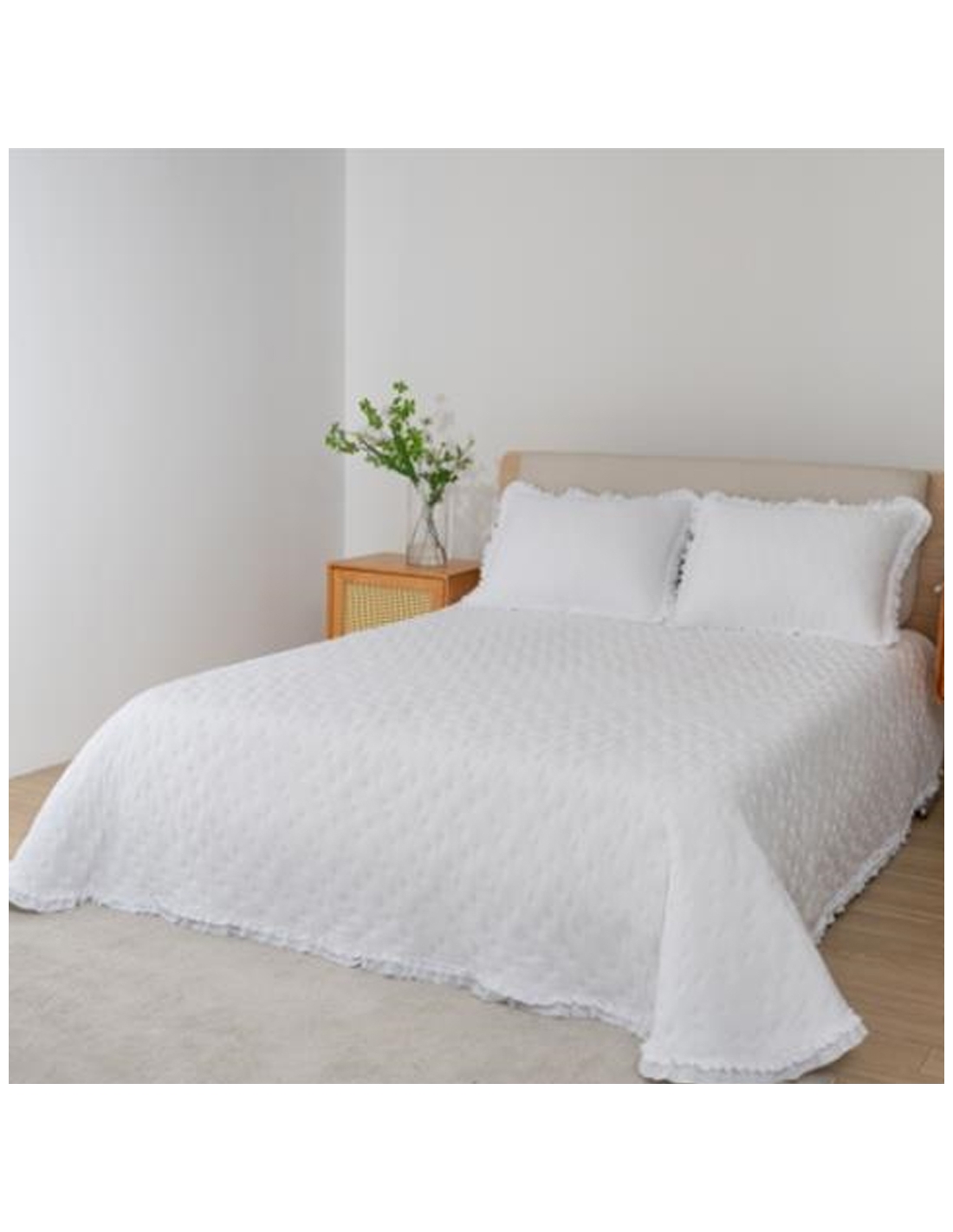 Colcha modelo Sizán en tejido 100% poliéster con elegante estampado y ribete de volantes. 0% encogimiento y con tratamiento stone washed. DISPONIBLE EN VARIOS COLORES Y MEDIDAS.