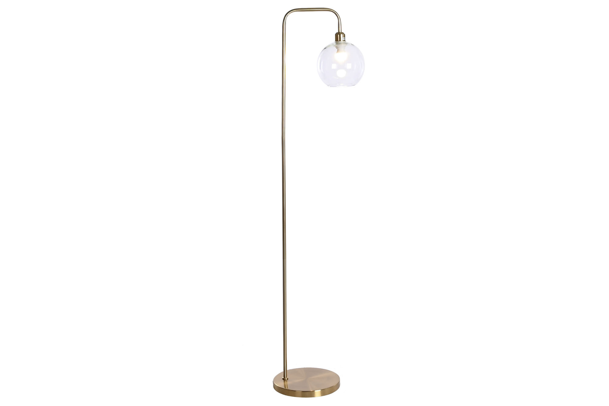 Lámpara de pie de metal dorada y tulipa de cristal.
