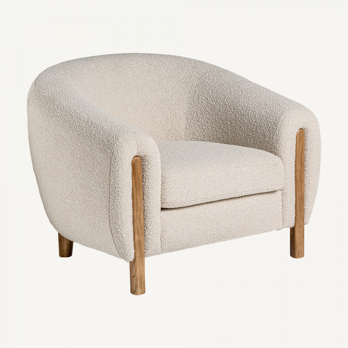 Sillón Boucle en tejido blanco con detalles de madera de roble. Medidas 94 x 87 x 76