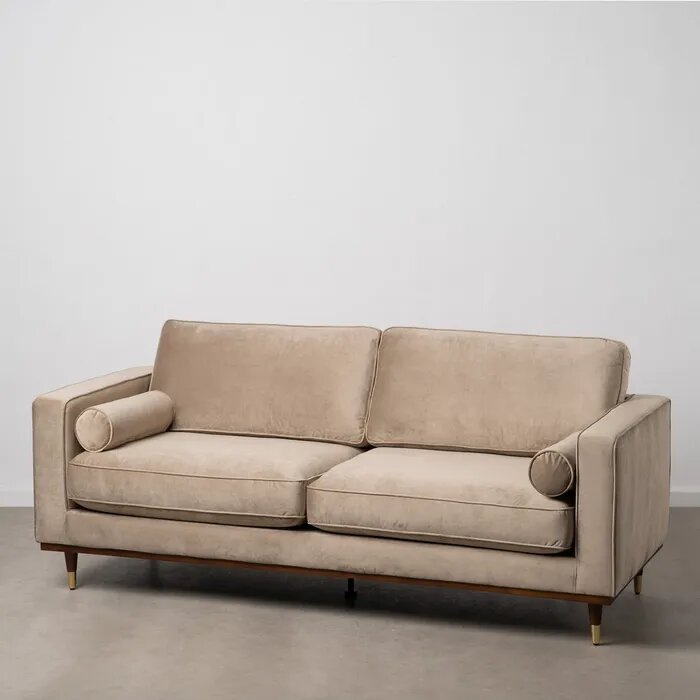 Sofá de tres plazas con tejido terciopelo color champán. Estructura aglomerada. Medidas 215 x 89 x 91